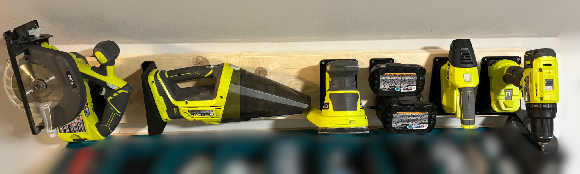 The objective of this project was fairly straightforward - neatly mount all 5 of my Ryobi brand power tools on the wall.